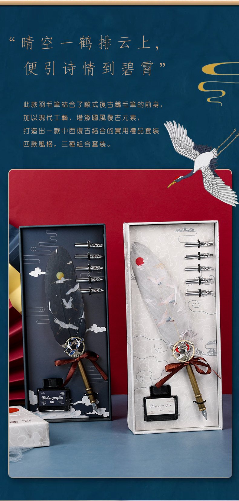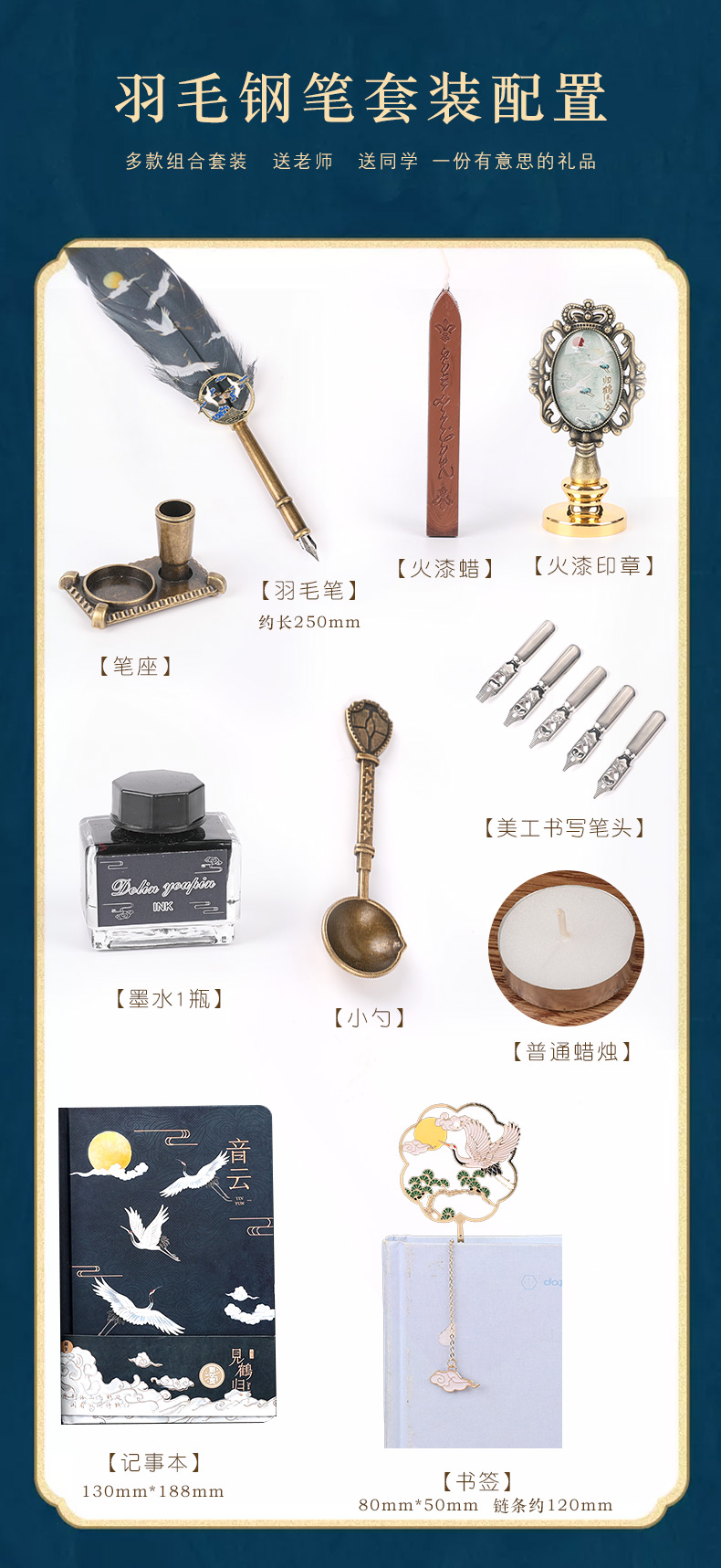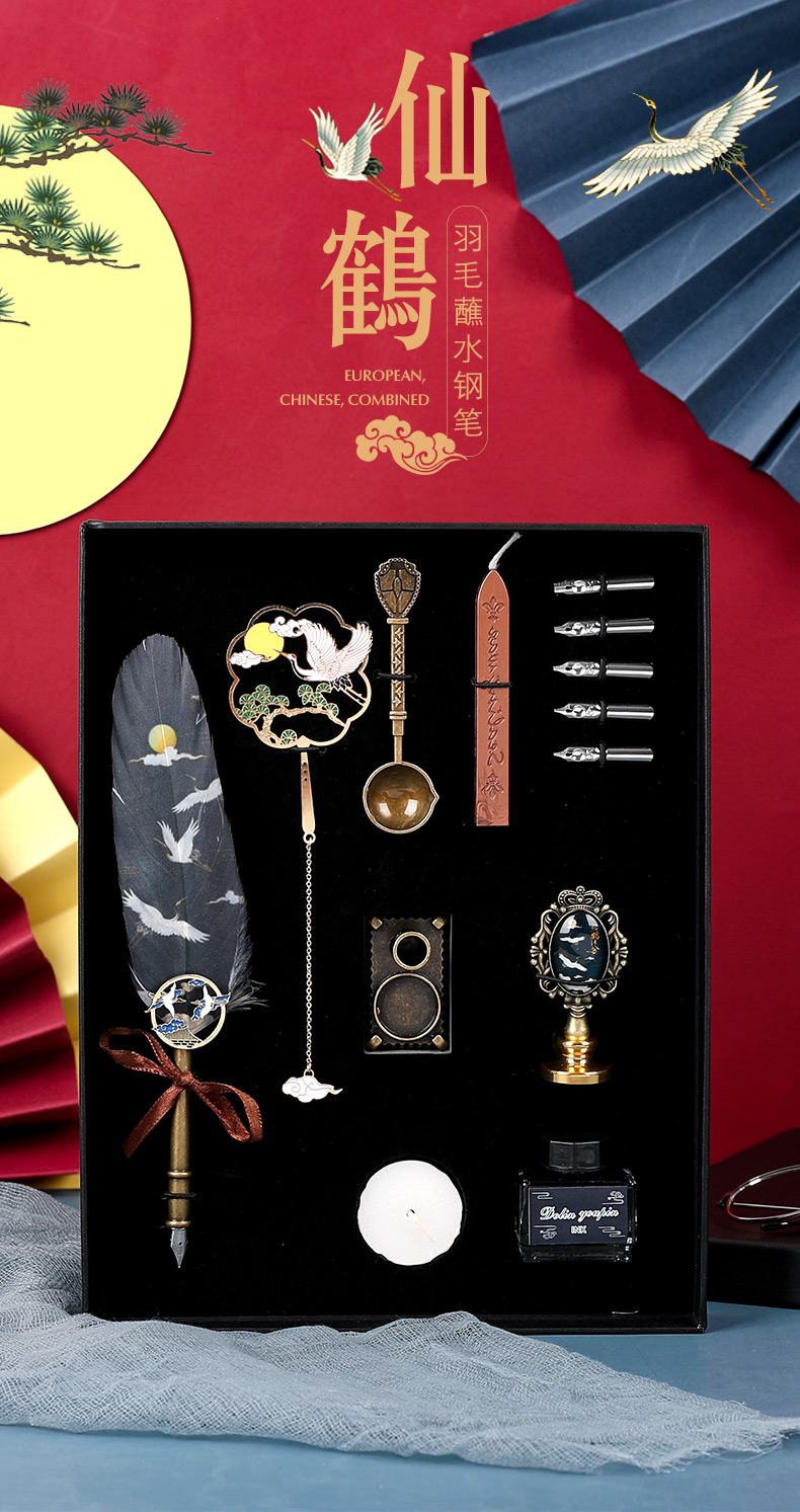 中国风蘸水笔火漆印章礼盒套装古风羽毛笔钢笔教师节礼物送老师纪念品同学生日小礼品文个性创意文艺精致复古 仙鹤羽毛笔本子9件套--山松